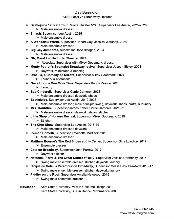 I moved to New York in 2013 where I supervised wardrobe cruise ship entertainment on Holland America Line for 3 years. I became a Local 764 IATSE wardrobe union member in 2016 and have worked on Beetlejuice, The Cher Show, Cats, Great Comet of 1812, Cirque du Soleil’s Paramour, New York City Opera, Fiddler on the Roof, Sleep No More NYC. I also work out of my home, doing alterations, making custom garments, and a line of face masks featuring my sketches. There are many other employment opportunities that present themselves around wardrobe, such as stitching for fashion week, costume projects of theater co-workers, drag performers commissioned pieces, and film/tv tailoring.